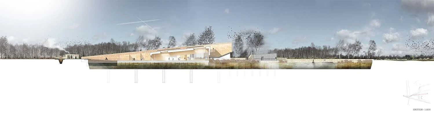 The second, and most prominent part of the building is a semi buoyant public visitor centre which acts as a visual bearing beacon from which to explore. A cafe and gallery space provide visitors with a comfortable environment for peatland exploration, and provide an educational experience for visiting schools, the general public and wildlife enthusiast.